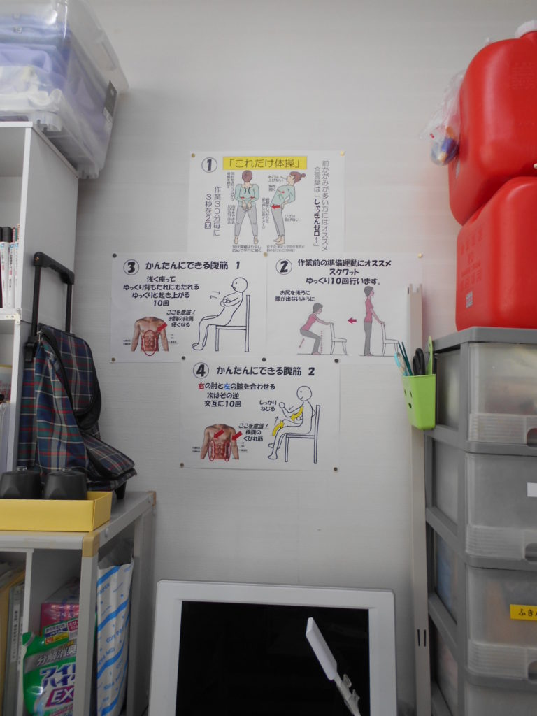 ヘルパーさんの控え室では、壁に運動の資料を掲示して、運動に取り組まれています